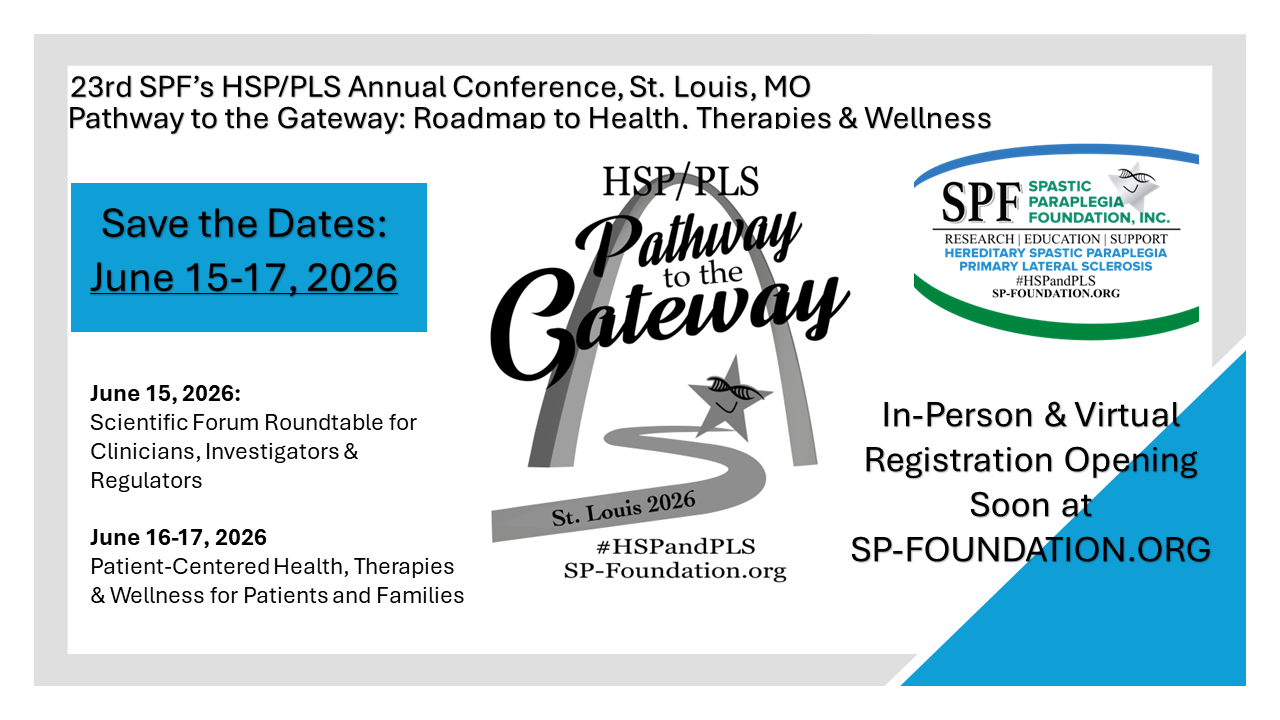 The Spastic Paraplegia Foundation (SPF) is thrilled to invite you and your family to join us in St. Louis, MO, June 15-17, 2026, for our 23rd Annual SPF HSP/PLS Annual Conference, a meaningful, welcoming gathering for patients, families, caregivers, and kids living with HSP and PLS.