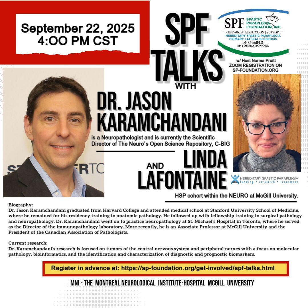 INVITATION: You are invited to a Zoom meeting with Dr. Jason Karamchandani and Linda Lafontaine for an inspiring session of SPF TALKS. This conversation will bring together the expertise of a leading clinician-scientist and the passion of a dedicated patient advocate to highlight the importance of research partnerships, patient engagement, and global collaboration in accelerating progress toward treatments for HSP and PLS.